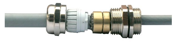 將電纜穿出電纜防水接頭,去掉外護(hù)層,將屏蔽層壓在屏蔽錐面上