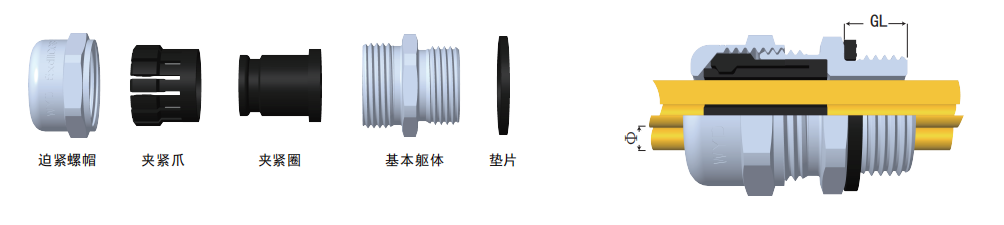 防護(hù)等級(jí):在規(guī)定的卡口范圍內(nèi),使用扁平密封圈旋緊迫緊頭,達(dá)IP68