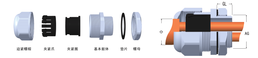 ☆ 產(chǎn)品材質(zhì):外部為尼龍PA66,夾緊爪為尼龍PA66,密封件為為EPDM或NBR橡膠橡膠